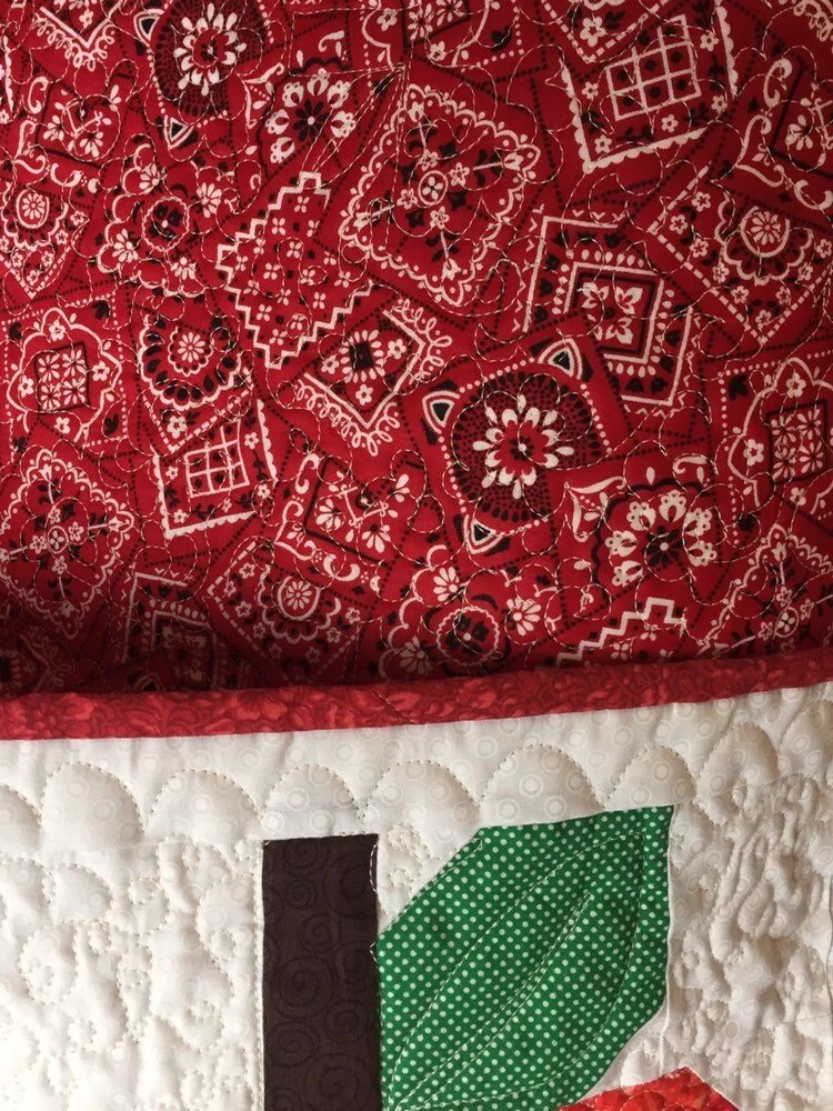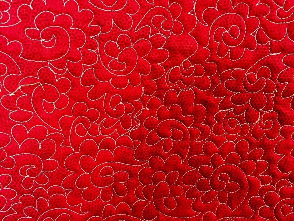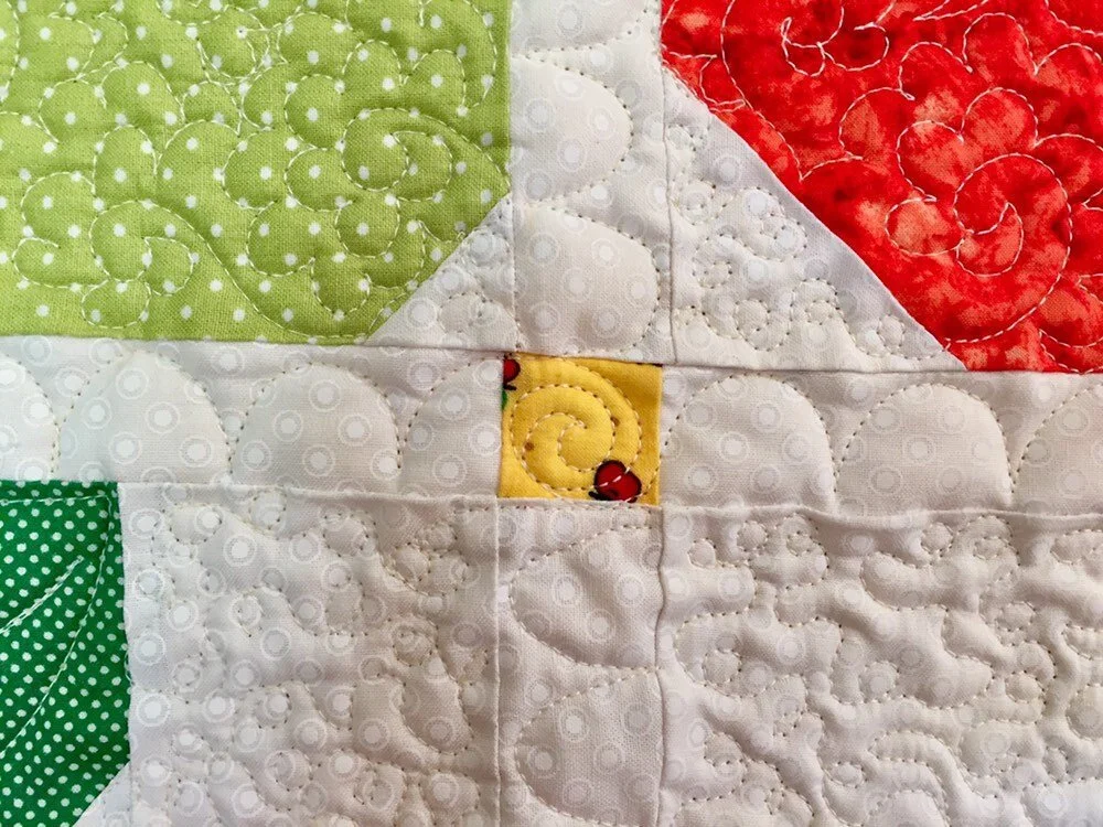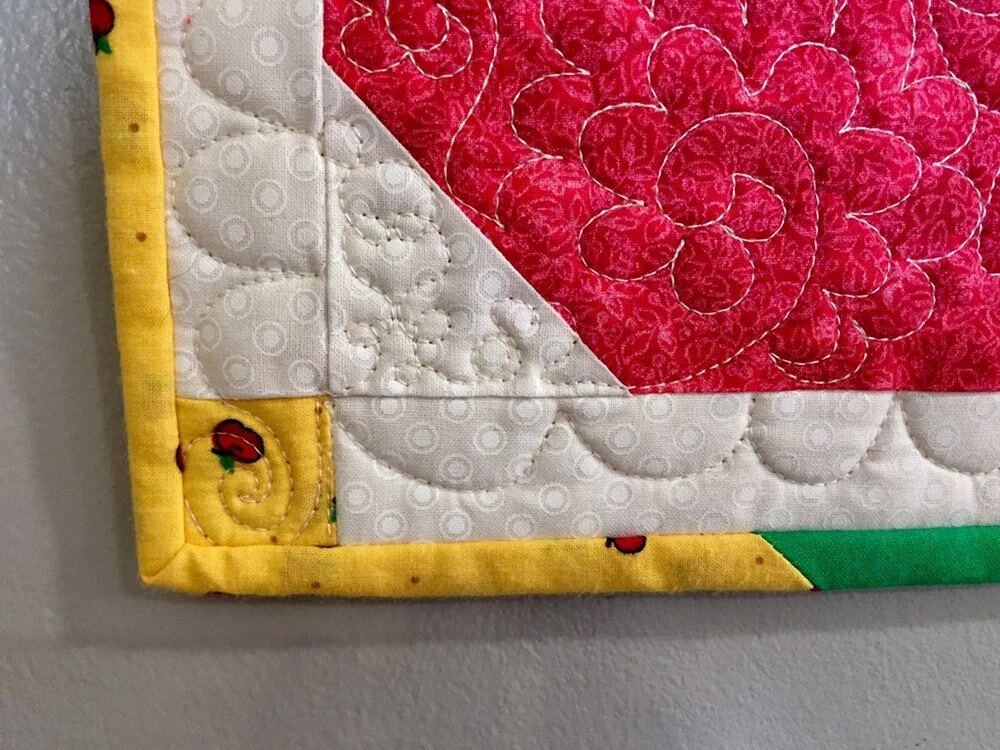 This handmade quilted wall-hanging or table-topper is made from cotton quilting fabric, cotton batting, and cotton thread. It is quilted with a variety of freehand designs including a floral loop, scallops, and loopy meander. White thread was used for quilting and the binding is machine-stitched onto the front, and hand-stitched on the back for a neat and clean finish. This would be a great gift for a teacher or to brighten up a kitchen!