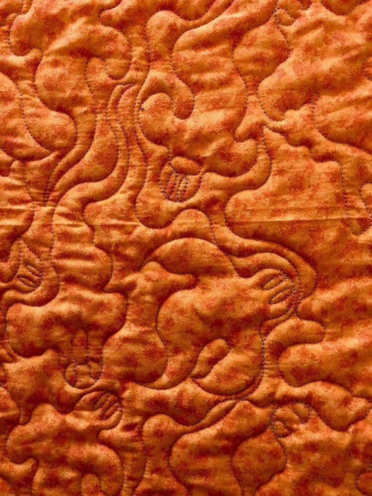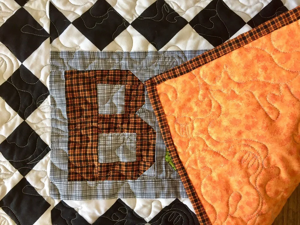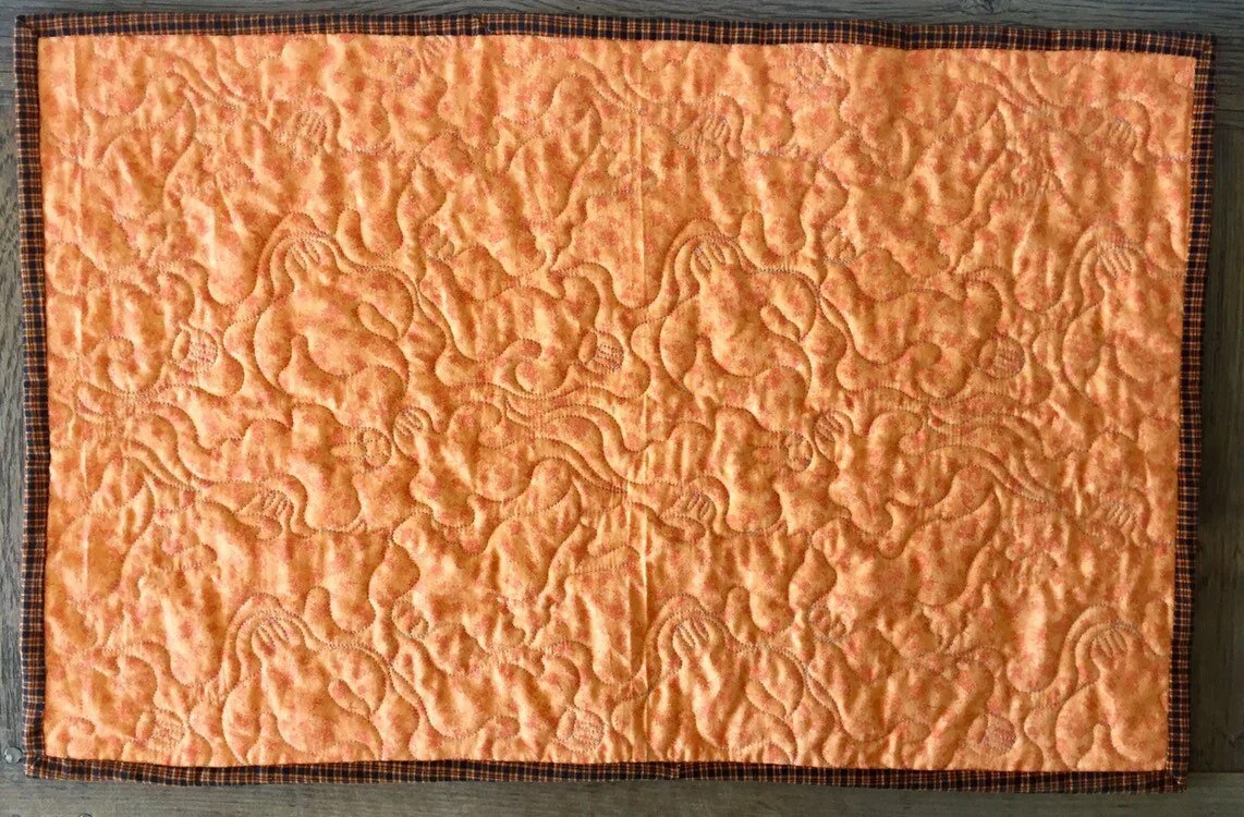 This handmade quilted wall-hanging or table-topper is made from cotton quilting fabric, cotton batting, and cotton thread. It is quilted with a ghost quilting pattern to enhance the patchwork. A light gray thread was used for quilting, and the binding is machine-stitched onto the front, and hand-stitched on the back for a neat and clean finish!