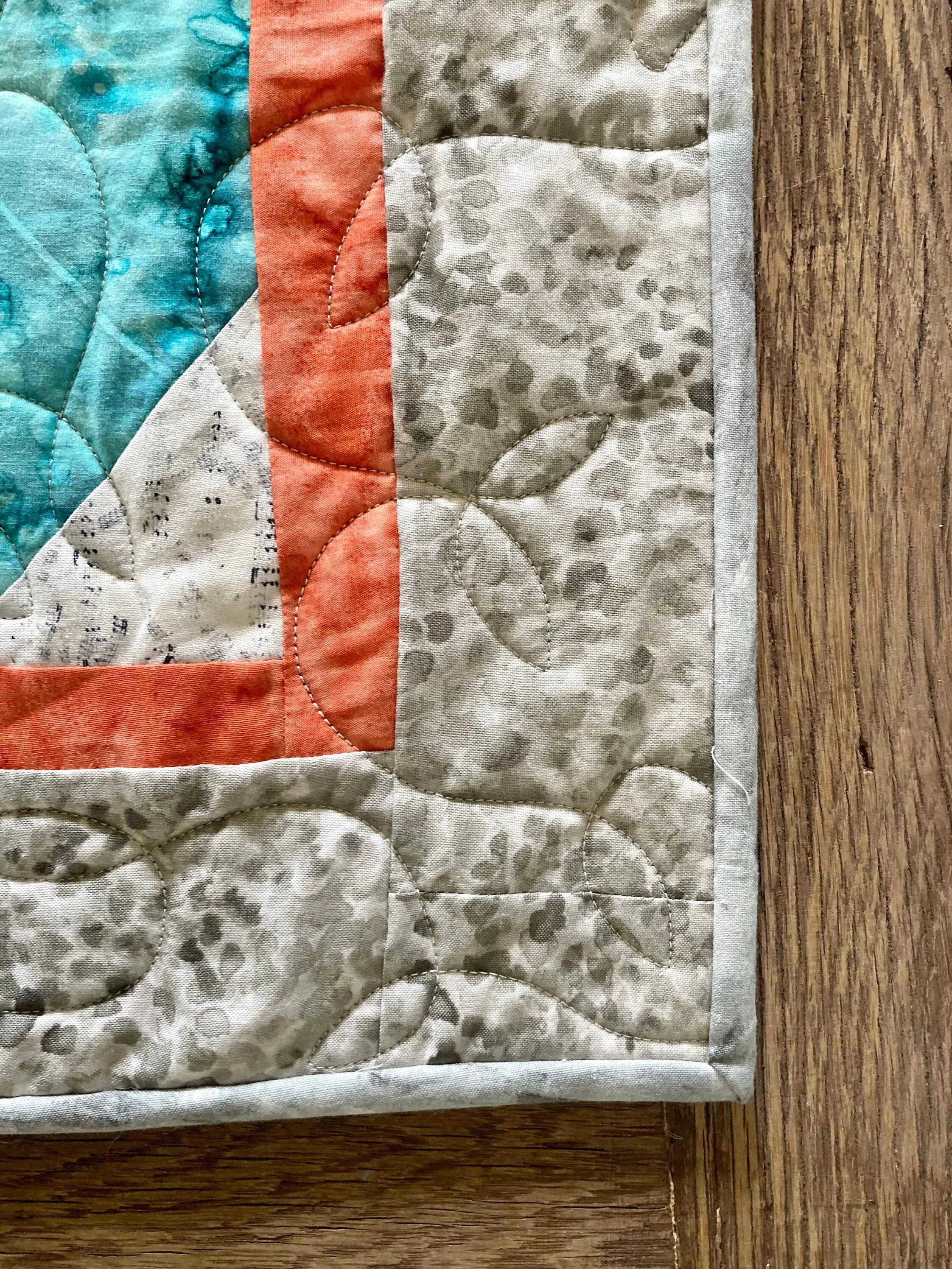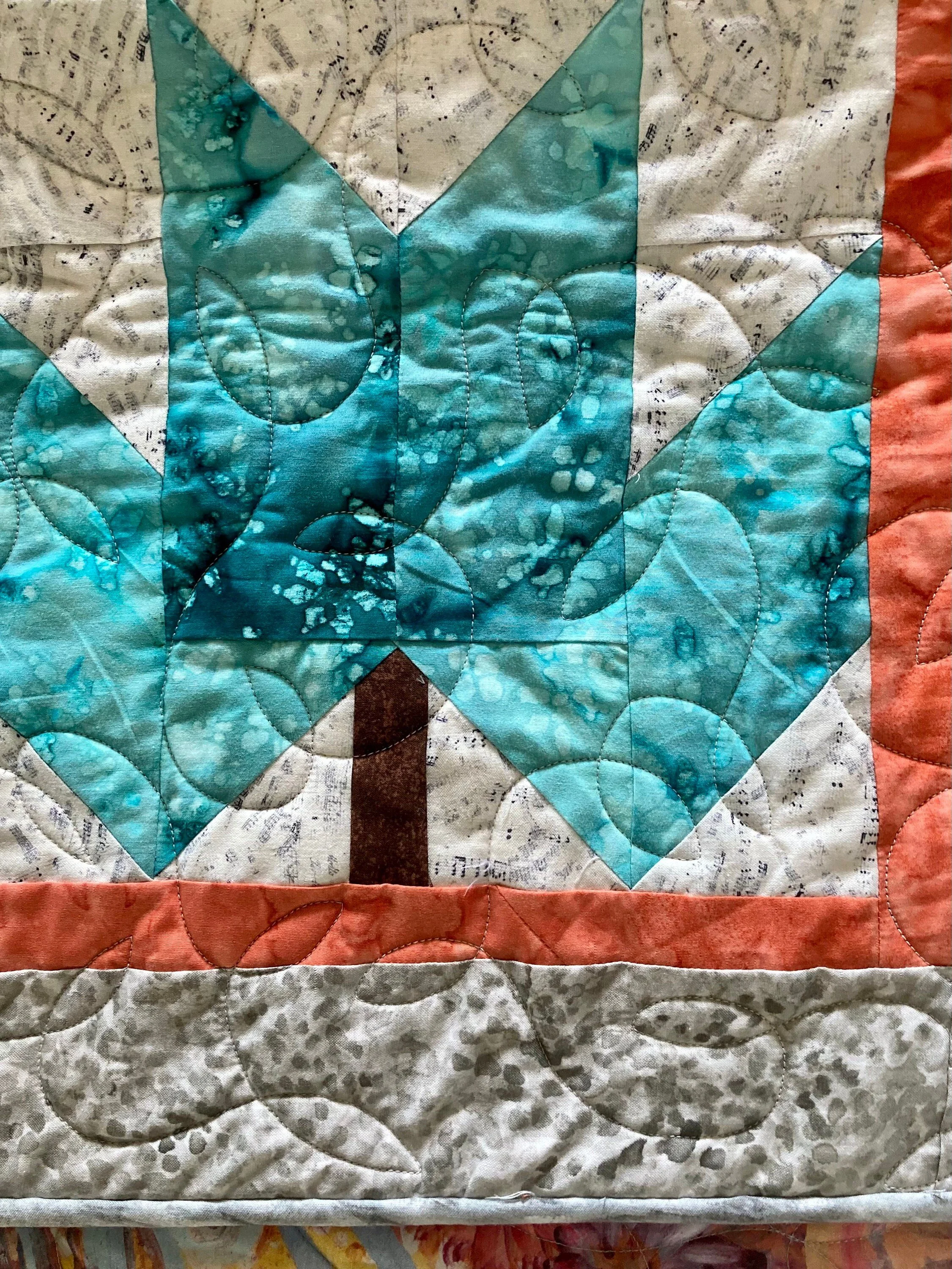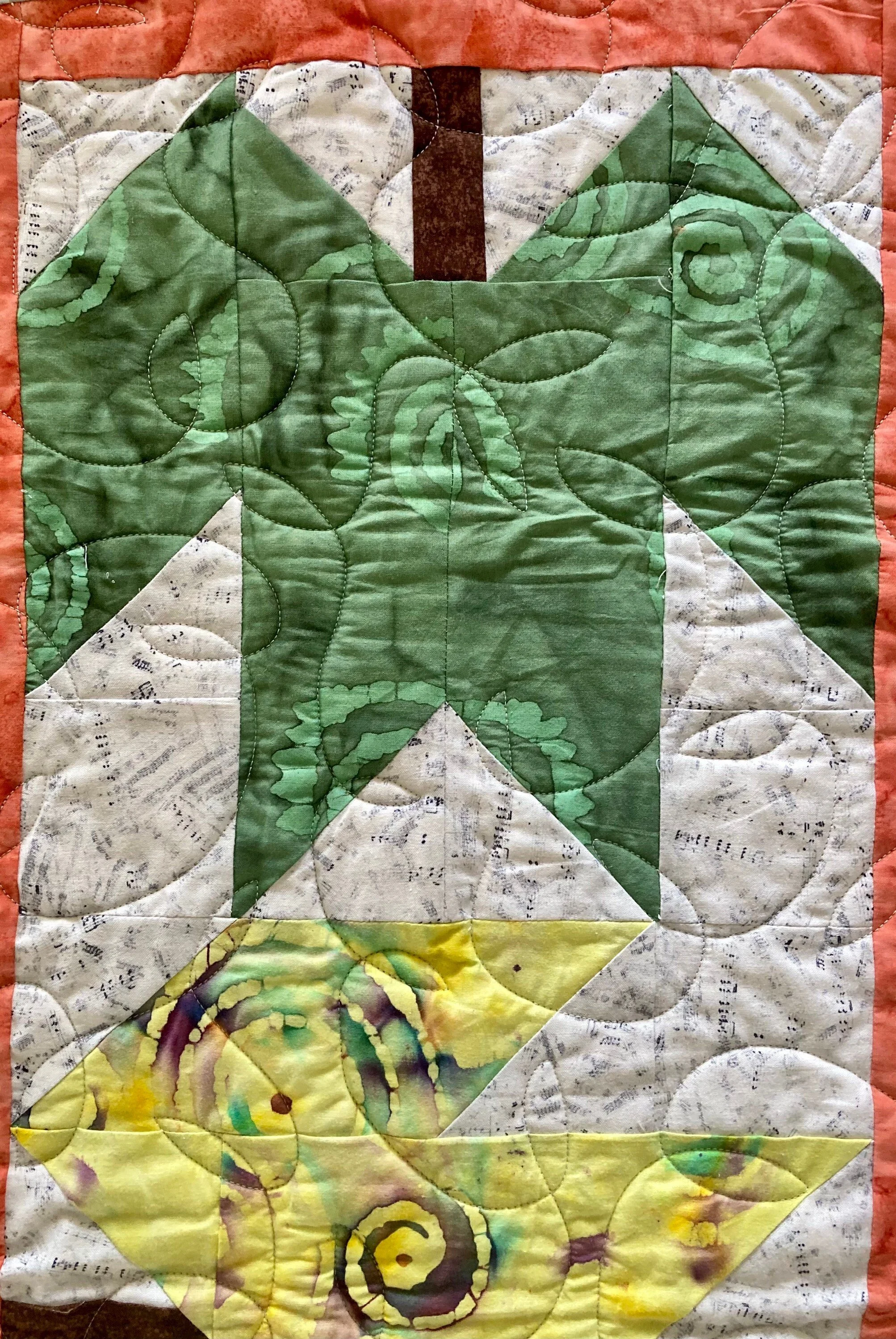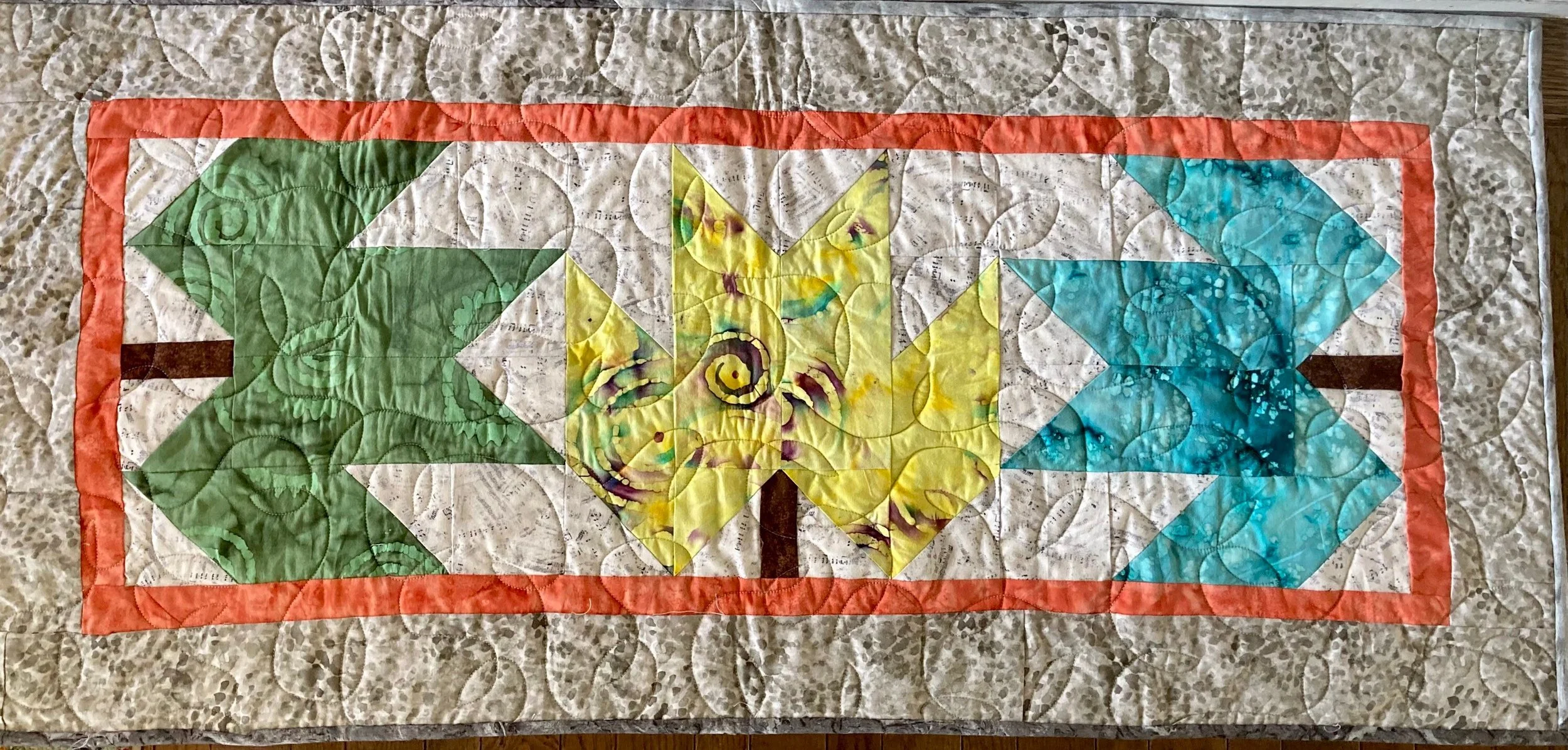 This handmade quilted wall-hanging or table-topper of the classic "Maple Leaf" quilt block is made from cotton quilting fabric, cotton batting, and cotton thread. It is quilted with a variety of free-motion quilting patterns to enhance the patchwork. An light gray thread was used for quilting, and the binding is machine-stitched onto the front, and hand-stitched on the back for a neat and clean finish!