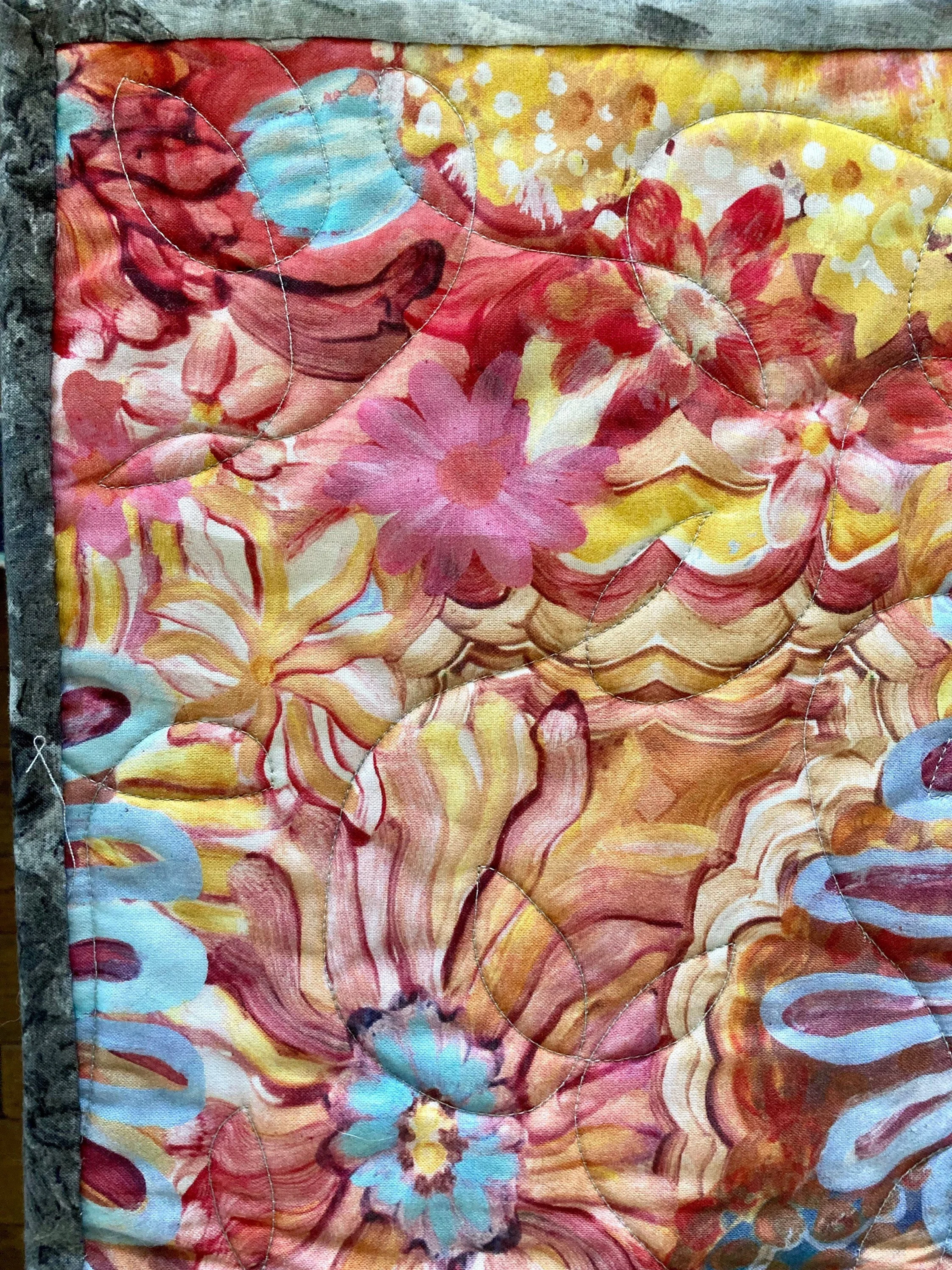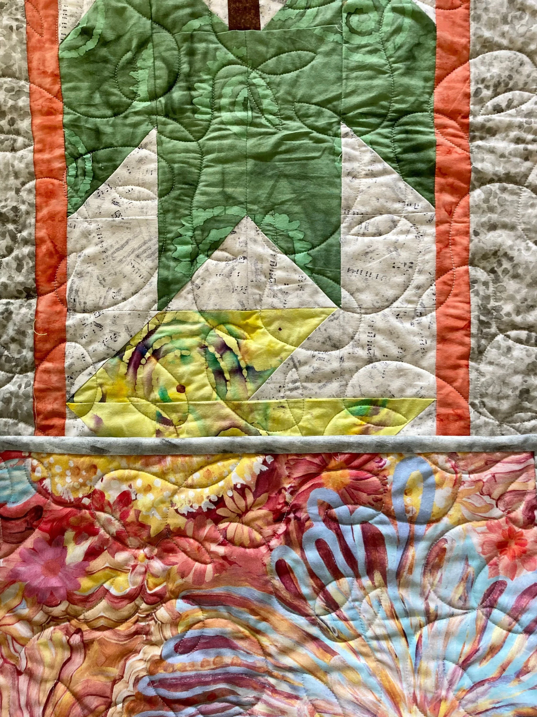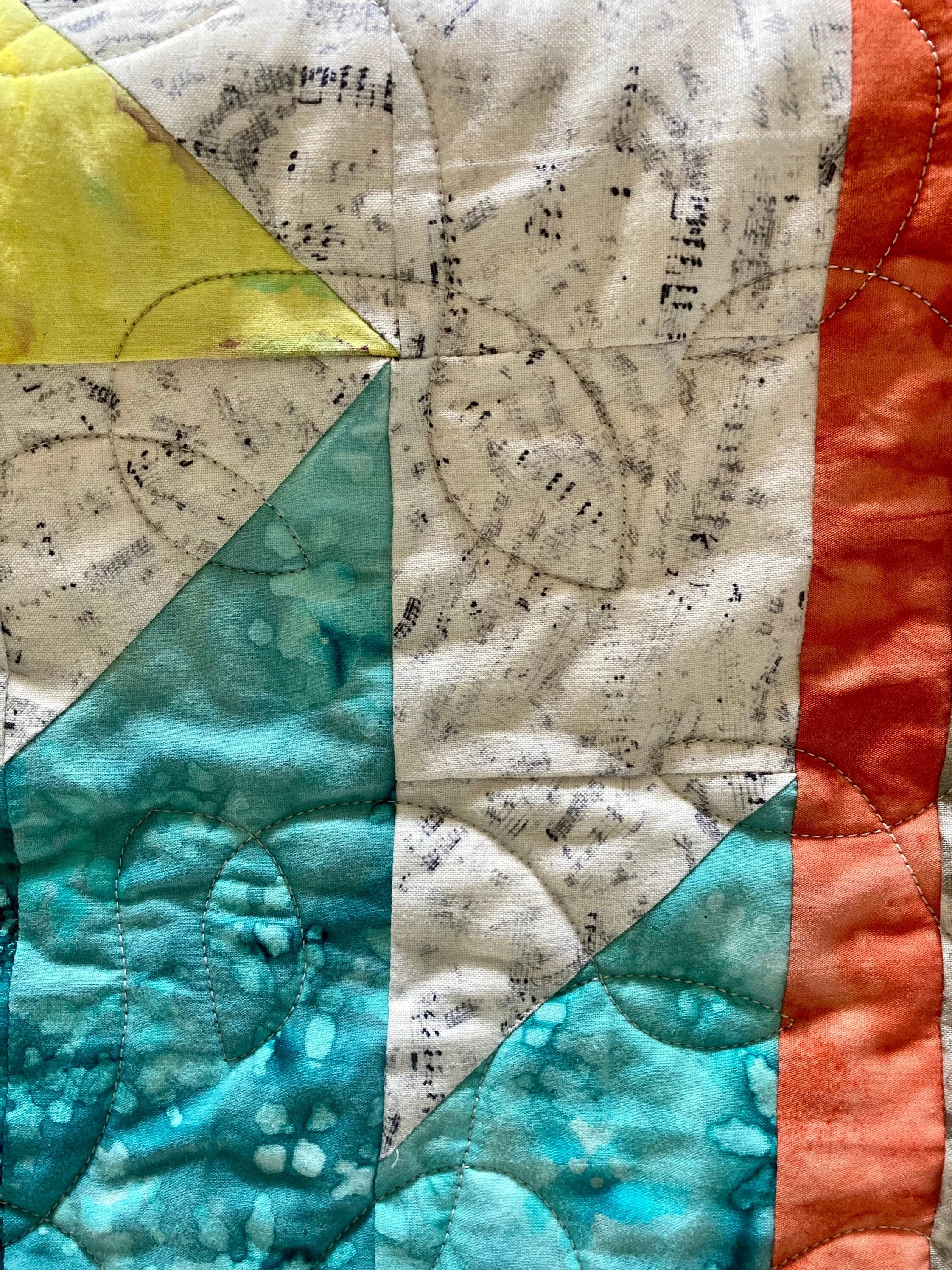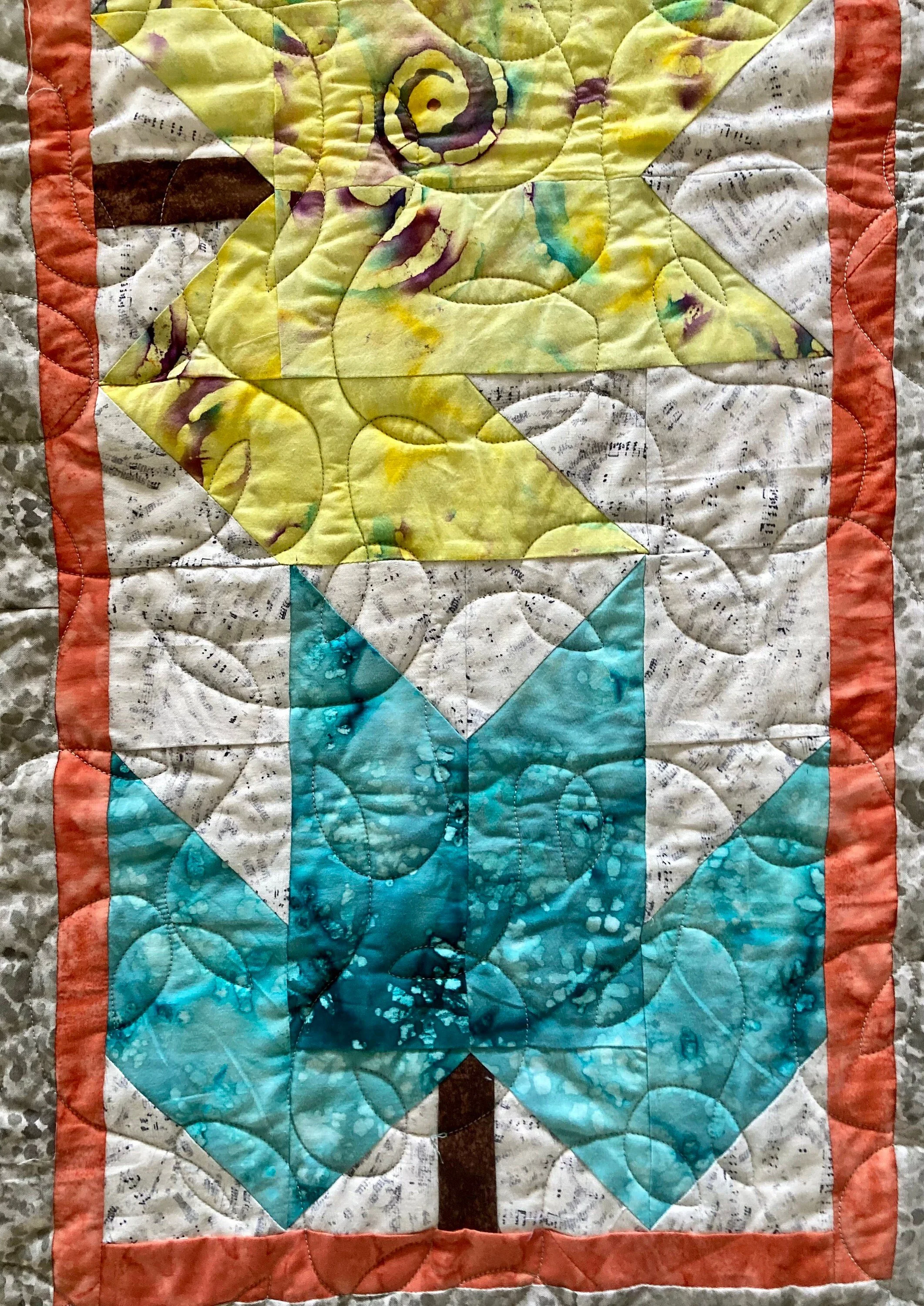 This handmade quilted wall-hanging or table-topper of the classic "Maple Leaf" quilt block is made from cotton quilting fabric, cotton batting, and cotton thread. It is quilted with a variety of free-motion quilting patterns to enhance the patchwork. An light gray thread was used for quilting, and the binding is machine-stitched onto the front, and hand-stitched on the back for a neat and clean finish!