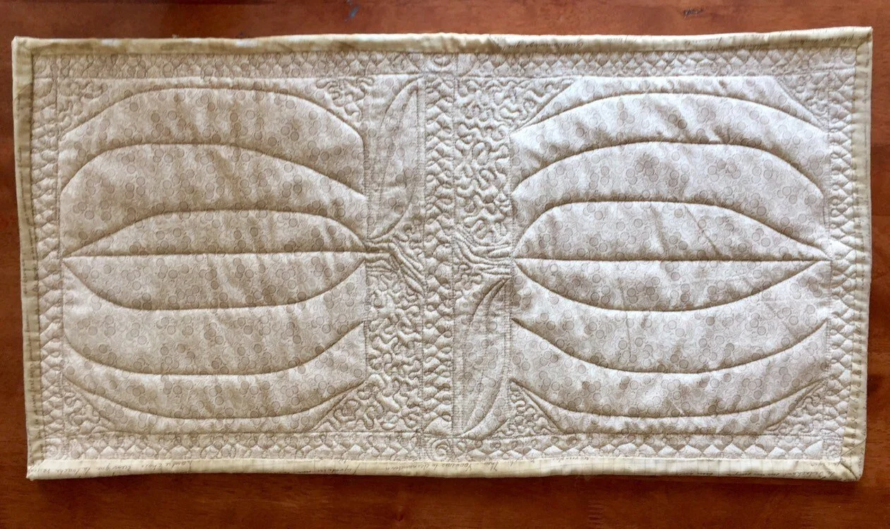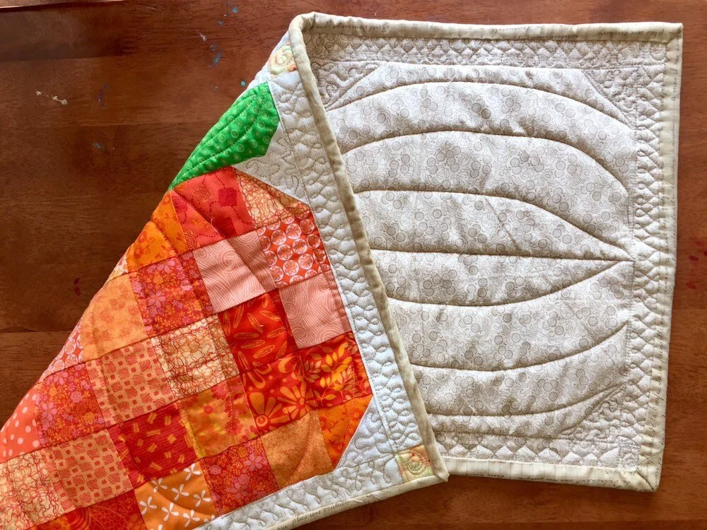 This handmade quilted wall-hanging or table-topper is made from cotton quilting fabric, cotton batting, and cotton thread. It is quilted with a variety of free motion quilting patterns to enhance the patchwork. An off-white variegated thread was used for quilting, and the binding is machine-stitched onto the front, and hand-stitched on the back for a neat and clean finish!