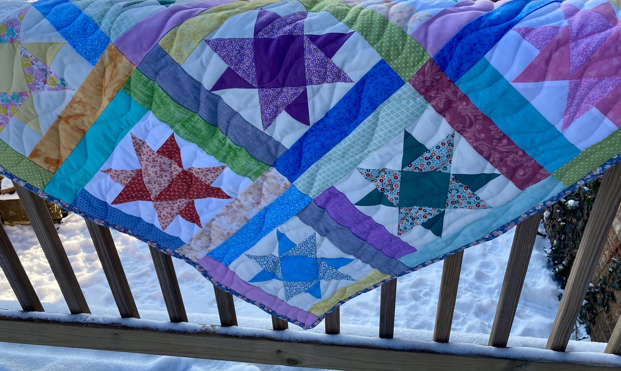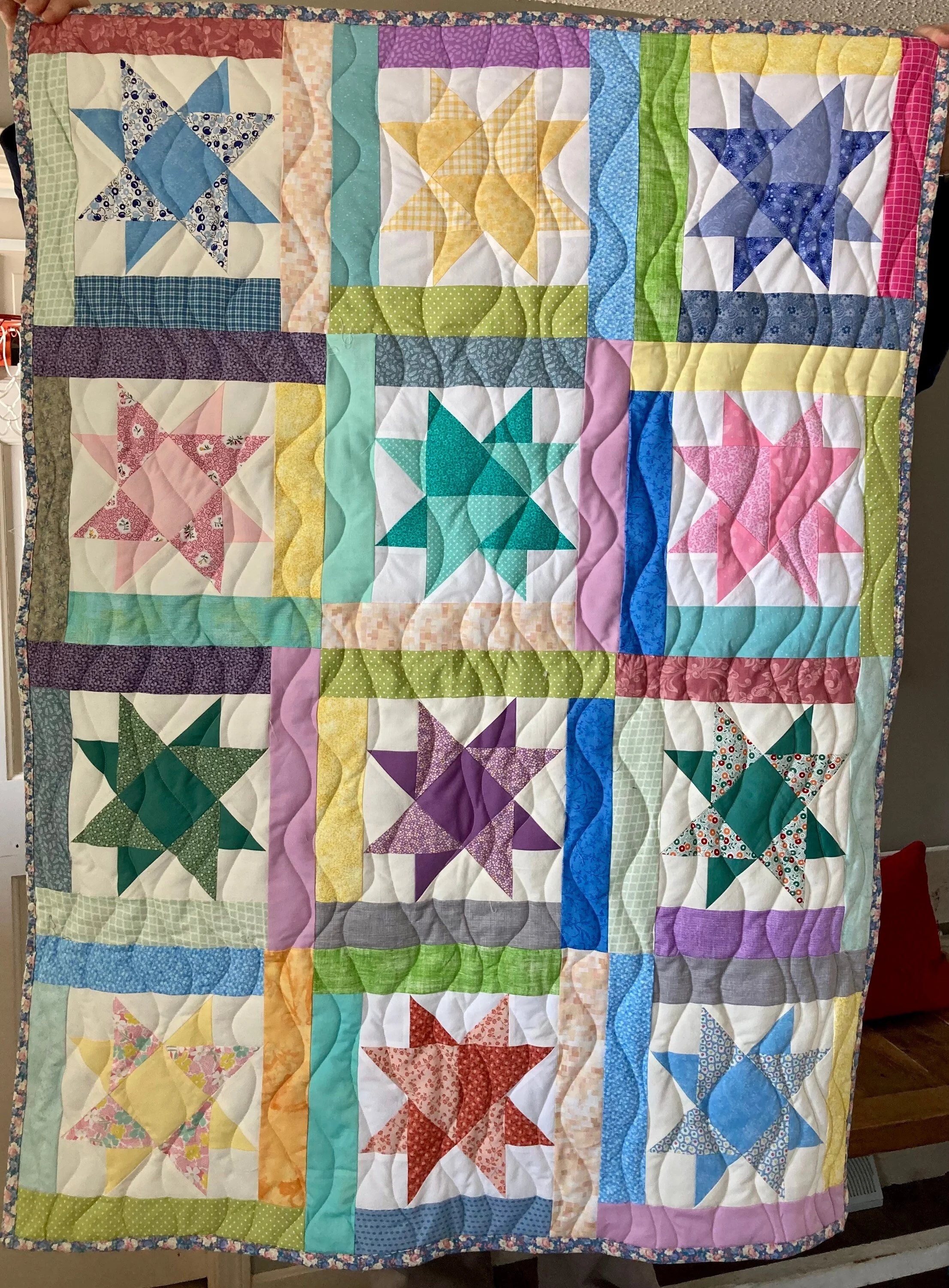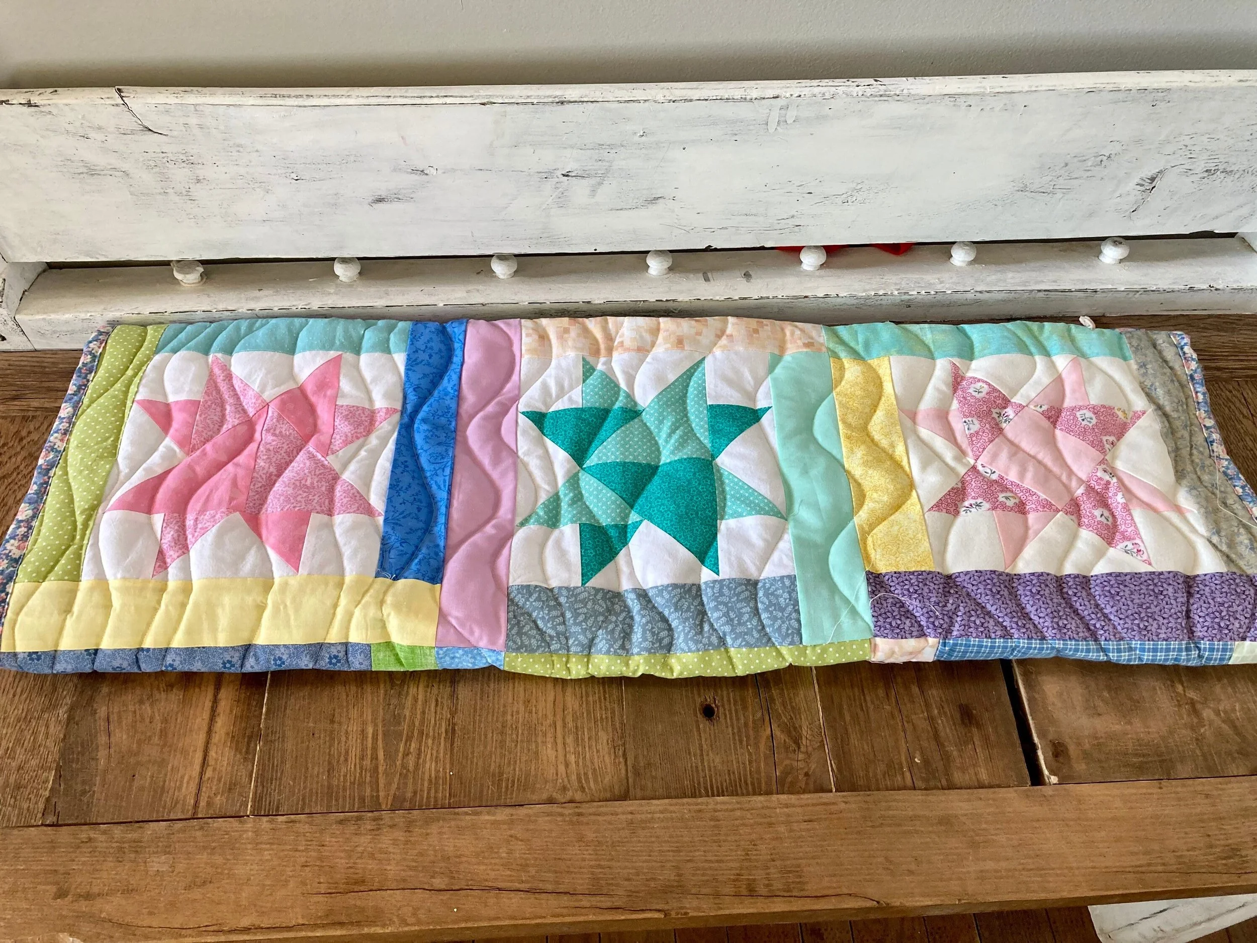 This quilt is made from 100% cotton fabric. It is approximately 52 inches long and 37.5 inches wide.