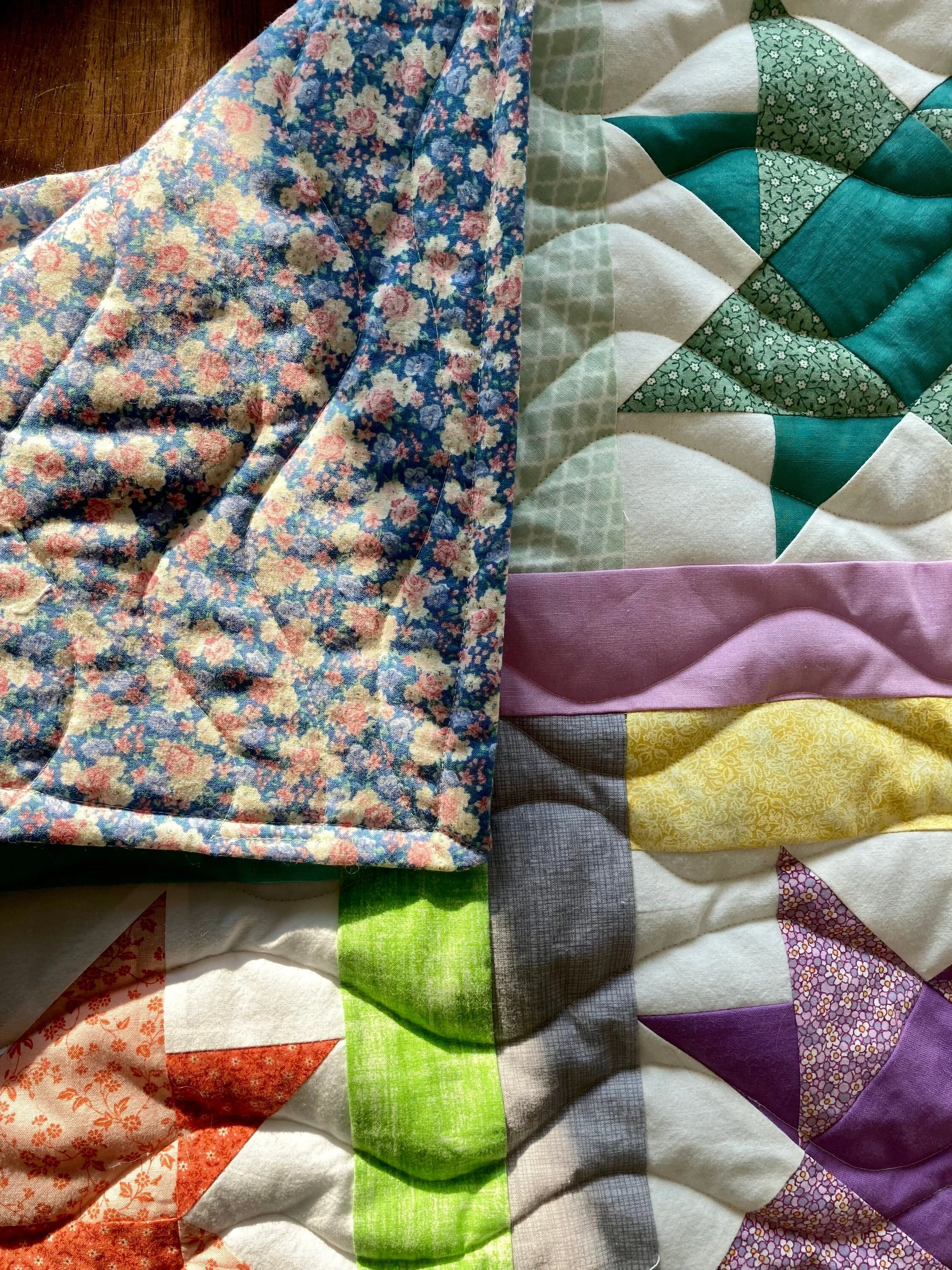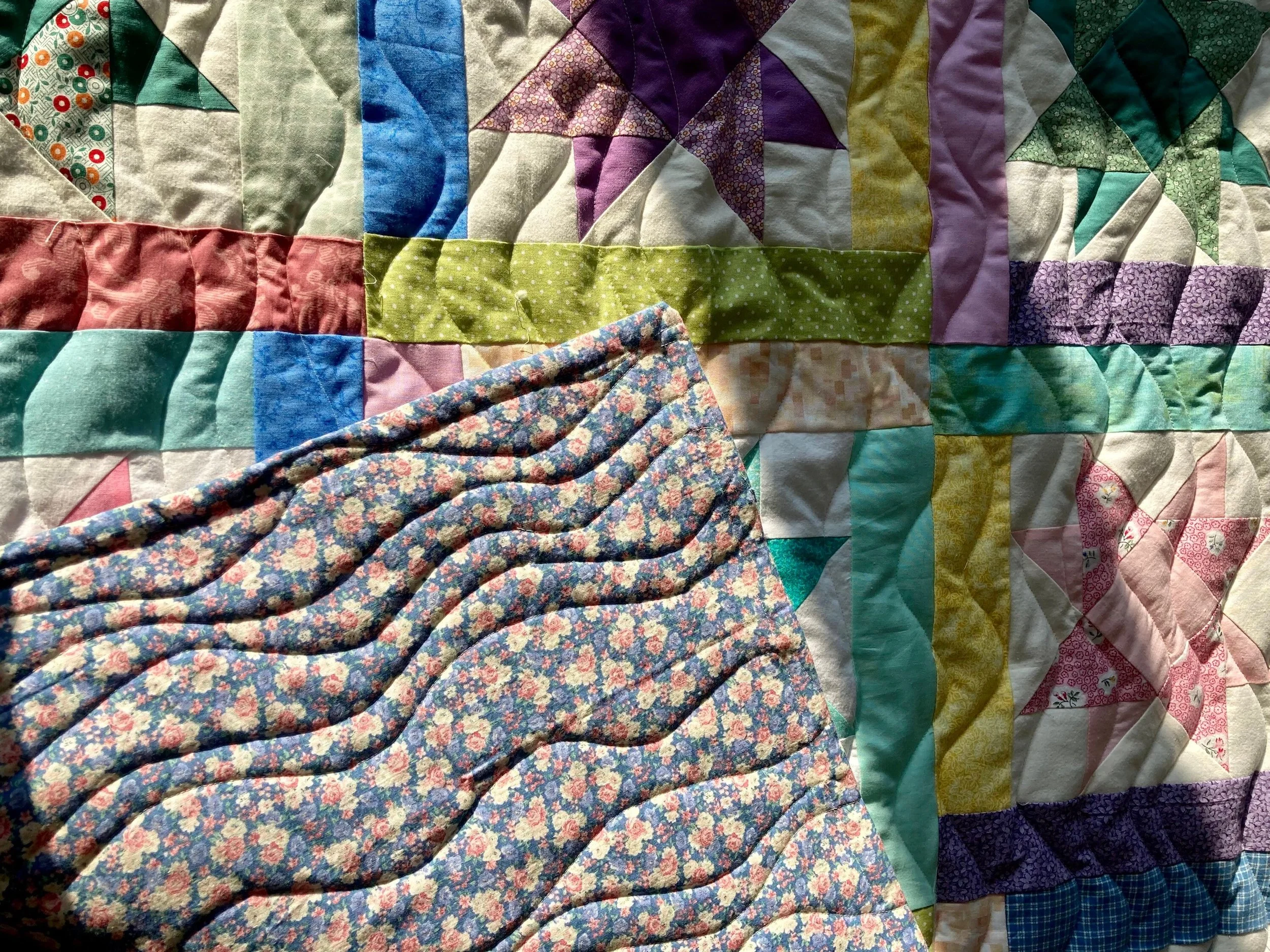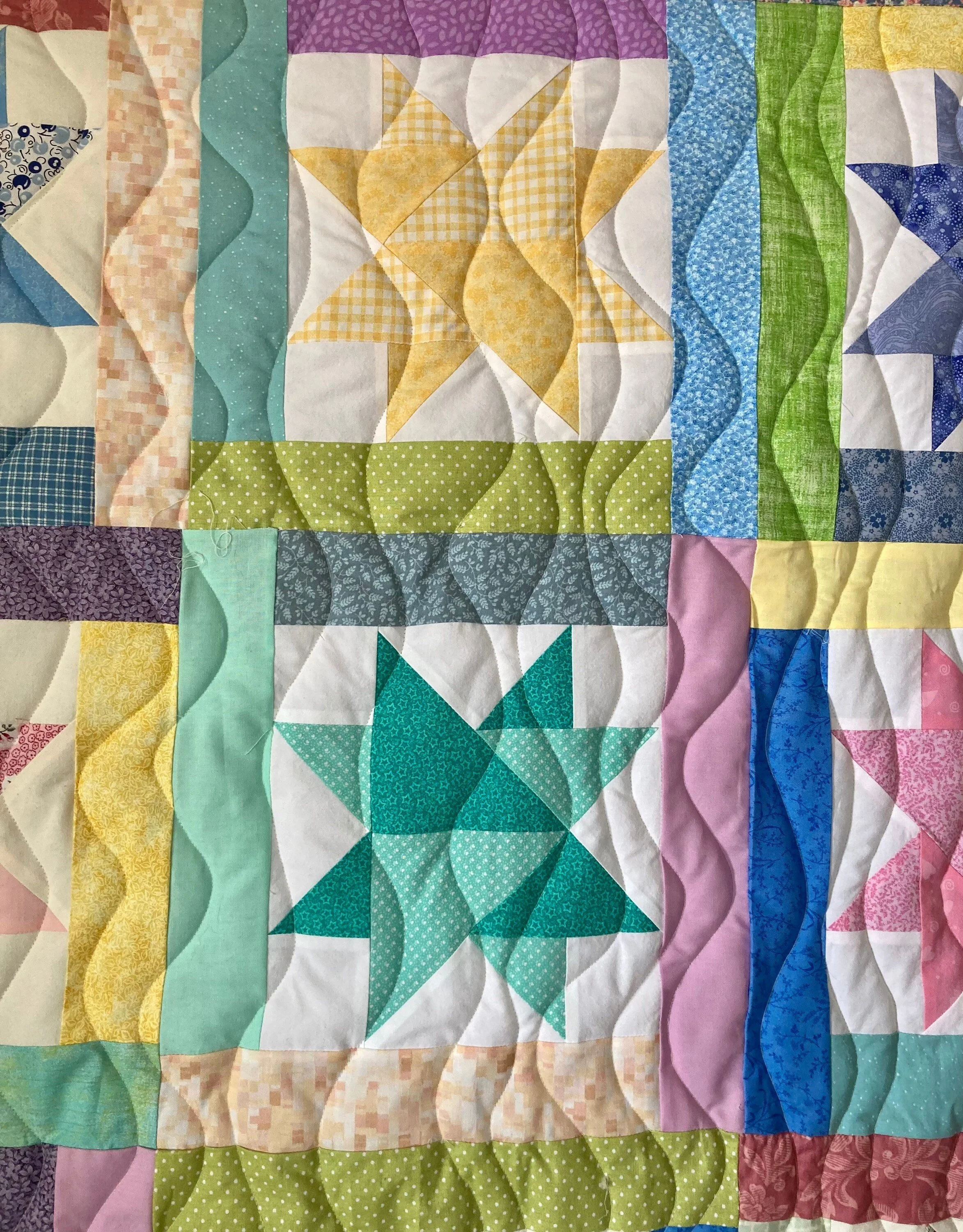It is quilted with a neutral cotton thread, free-motion wavy lines. That means it was all done by me, not a computer!