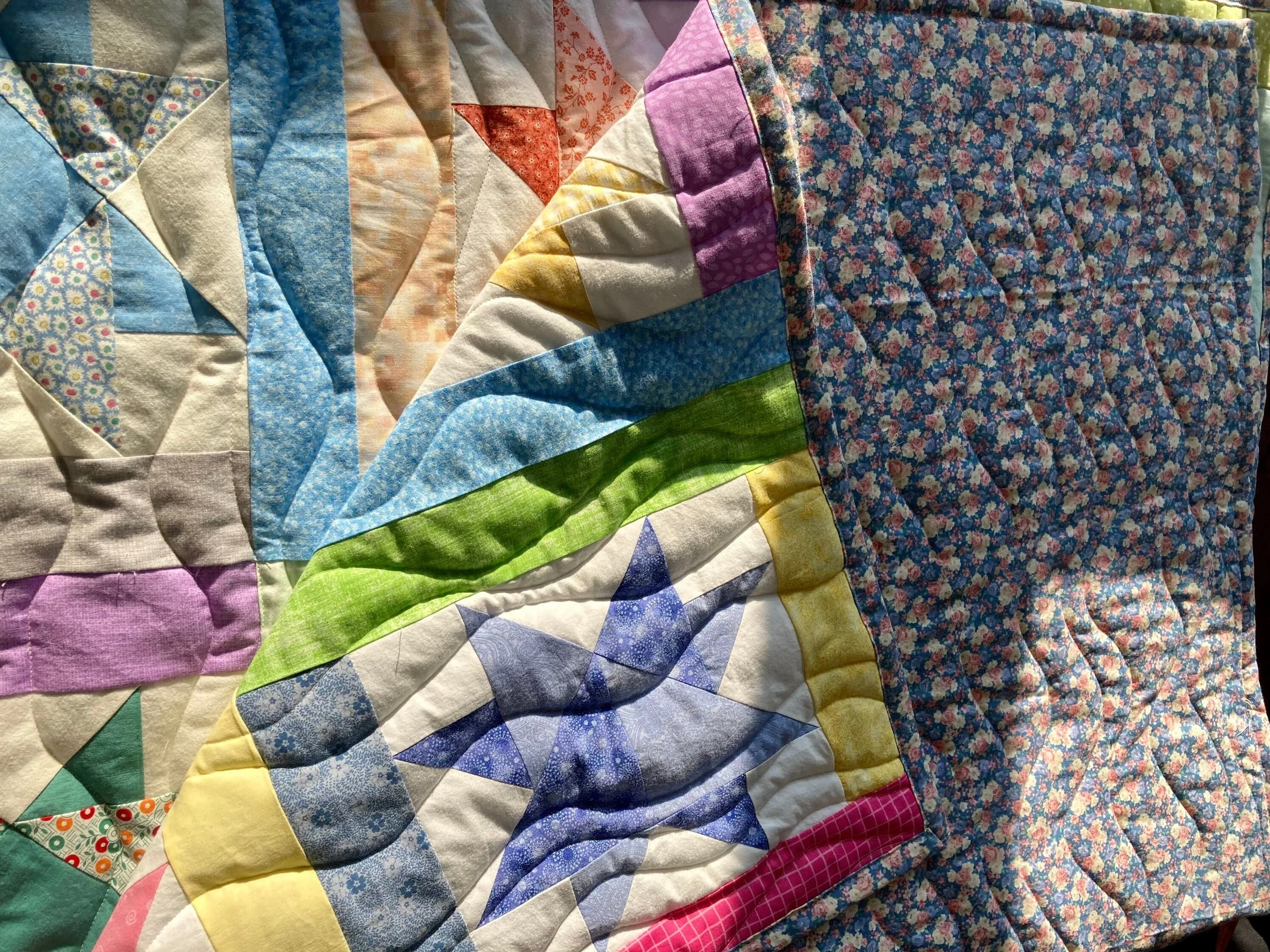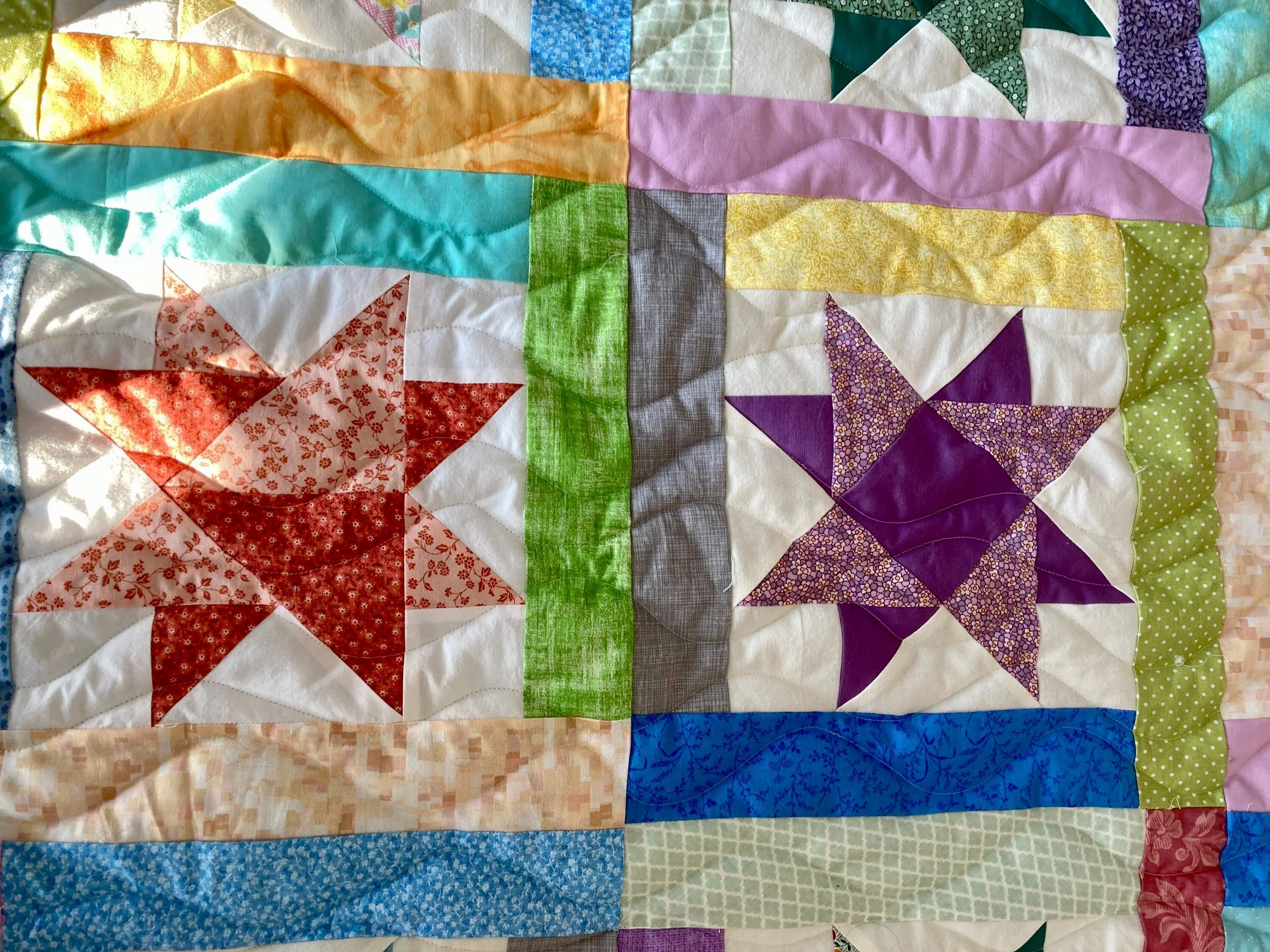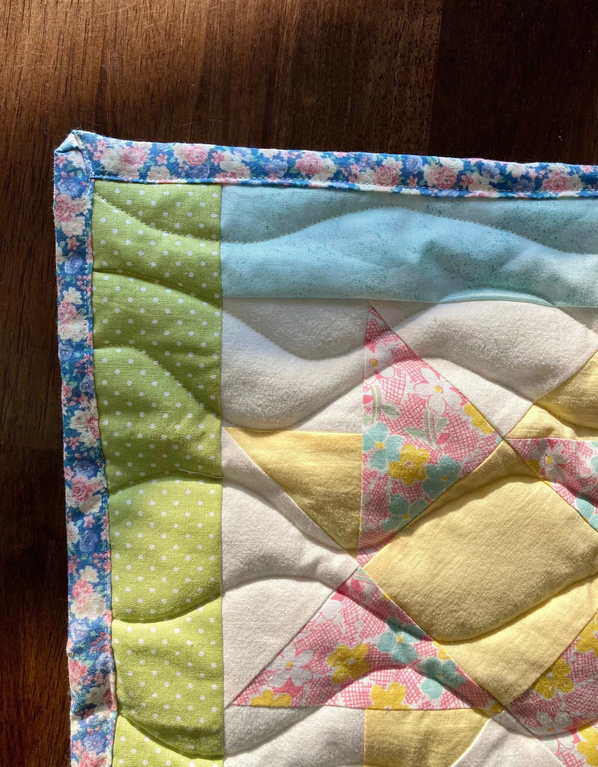 It is quilted with a neutral cotton thread, free-motion wavy lines. That means it was all done by me, not a computer!